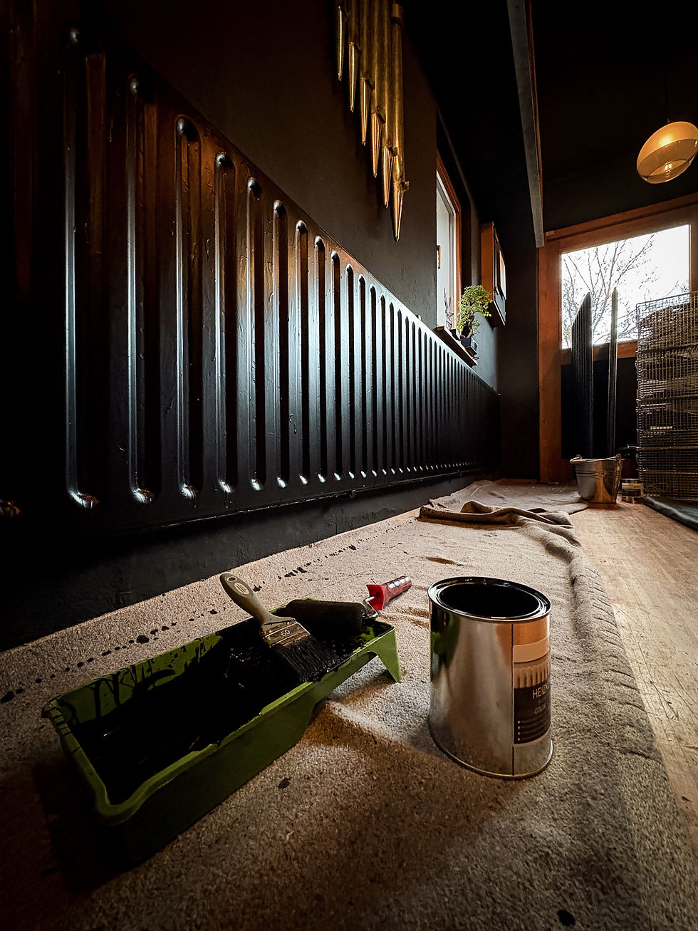 Es sind Details, wie beispielsweise die weiße Heizung, die im Vergleich zur schwarzen Umgebung dem Lautsprecher die Show stiehlt. Deshalb habe ich die Wärmespender passend zur Wand in Schwarz gestrichen.